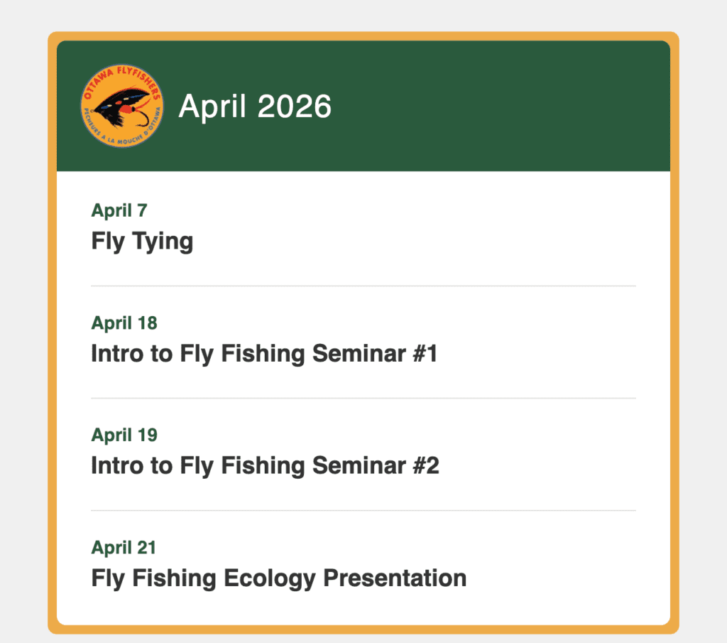 Send an email to: secretary@ottawaflyfishers.ca for inclusion. The Link below will take you to the page.