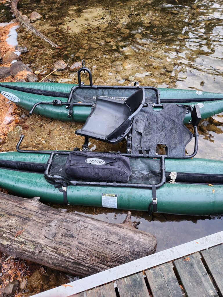 This Outcast Pontoon boat (pictured in a rainy day) includes an added swivel mount for the seat, a Scotty accessory mount and hooks for the oars. Sells for $2,500 new plus tax and shipping. Available for $890.